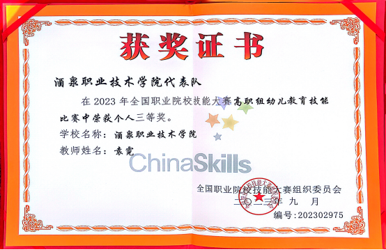 9月1日至9月3日,“中银杯”全国职业院校技能大赛(高职组)幼儿教育技能赛项(教师赛)在黑龙江幼儿师范高等专科学校举行。酒泉职业技术学院教师袁霓代表甘肃省参赛,凭借过硬的专业素养、理论基础和顽强拼搏的精神,经过激烈的角逐斩获全国三等奖,实现了我校幼儿教育技能赛项国赛教师组项目上的历史性突破。