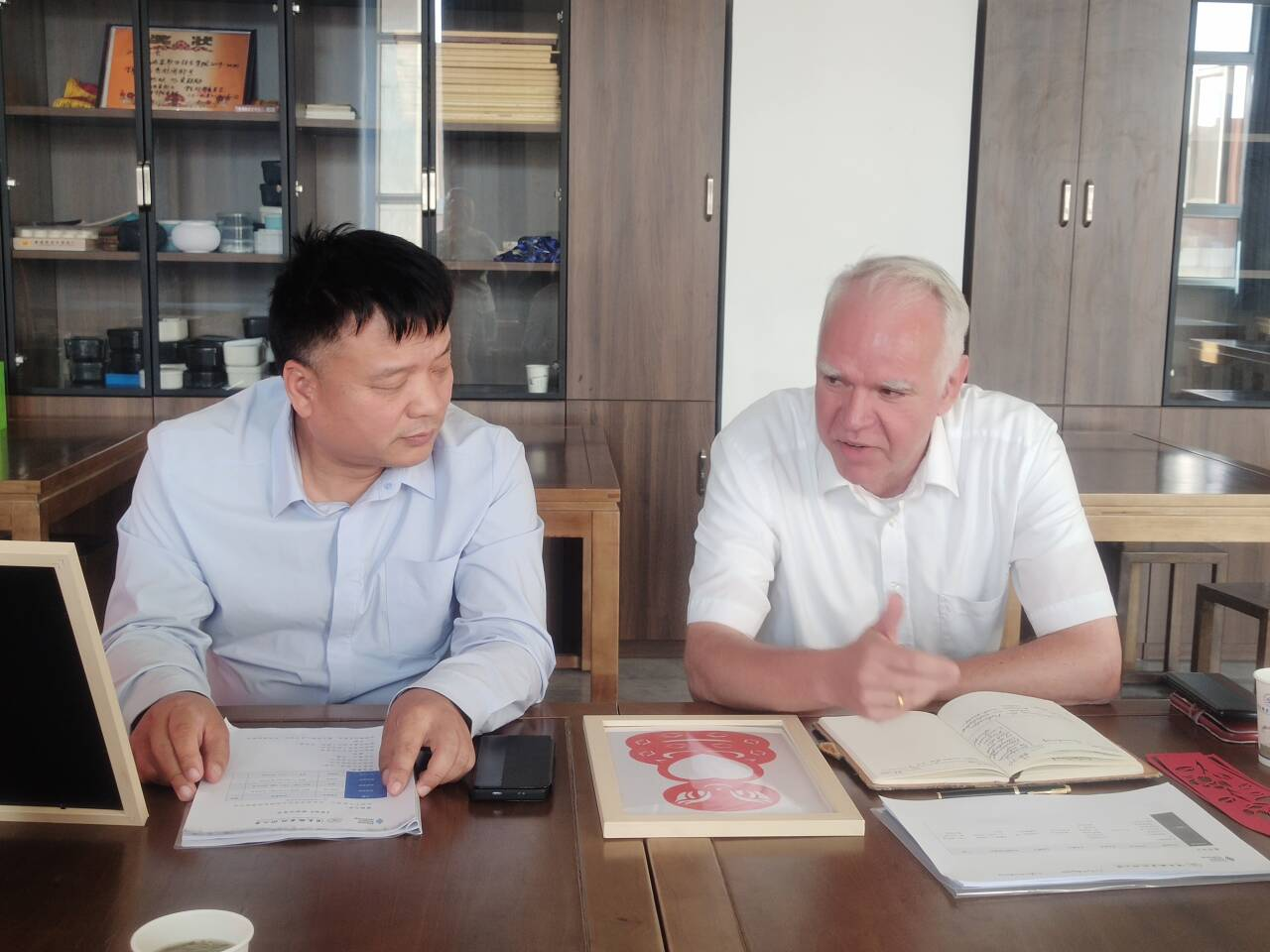 课堂中,张沐可老师以生动而富有感染力的教学方式,逐步引导学生深入体验剪纸艺术的魅力。教学环节层层递进,在材料选择环节,大家细致比较不同纸张与工具的特性,体现出对非遗技艺的认真态度;小组汇报环节,各小组依次清晰阐述本组的任务选择依据及成员具体分工,并分享创作思路的形成过程。整个过程中,德国专家施耐德先生凝神关注每个教学细节,不仅认真记录学生的操作表现和创意实现过程,还对教师的教学策略与方法进行了详尽观察与记录。