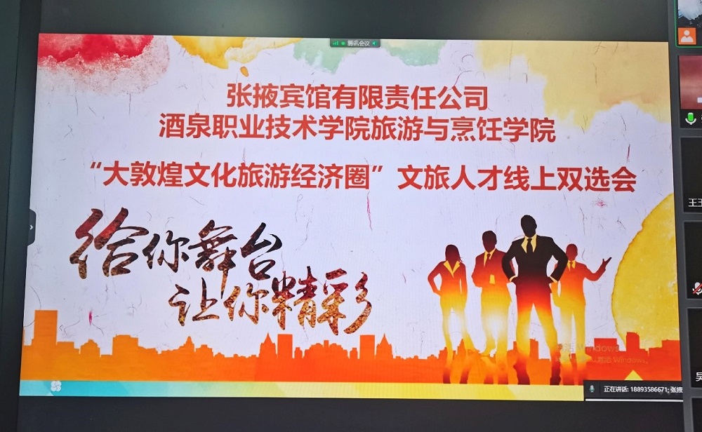 2月23日下午13:30,旅游与烹饪学院组织召开了“大敦煌文化旅游经济圈”文旅人才线上双选会。旅游与烹饪学院院长杨洁发表线上致辞,敦煌文旅集团、酒泉饭店、阿克塞文旅集团、张掖宾馆、玉门阳光酒店等酒泉及周边地区5家文旅企业参会, 2022届毕业生、各系主任及毕业班班主任参会,会议由副院长王晓梅主持。