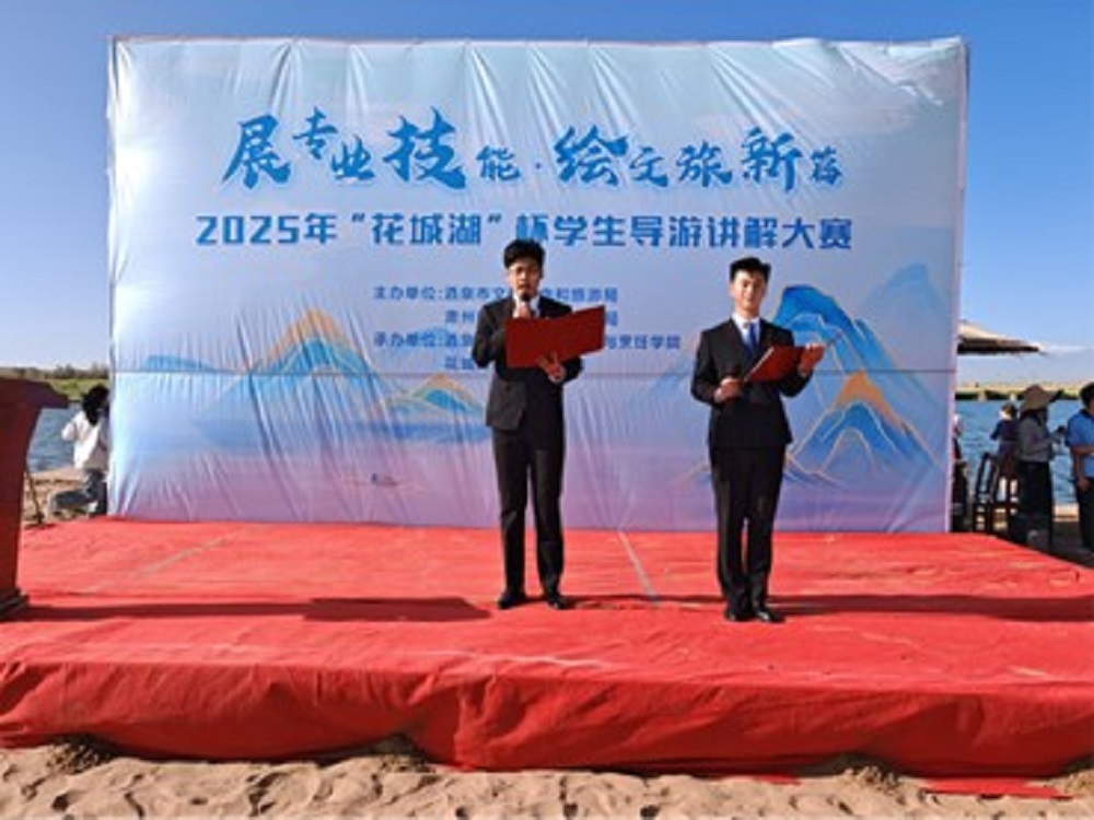 为深化教学成果,提升学生实践技能,2025年6月15日,由酒泉市文体广电和旅游局、肃州区文体广电和旅游局指导,酒泉职业技术大学旅游与烹饪学院联合花城湖景区承办的 “展专业技能·绘文旅新篇”2025年“花城湖”杯学生导游讲解技能大赛,在花城湖风景区成功举办。来自旅游与烹饪学院的选手同台竞技,以专业风采诠释丝路文旅魅力。