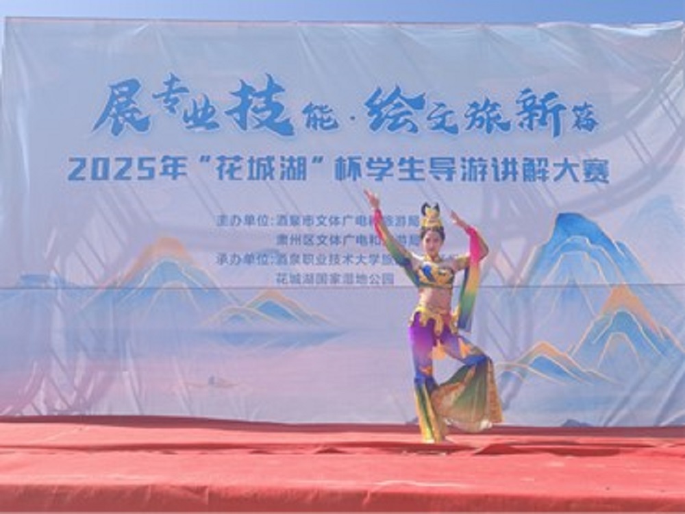 比赛环节精彩纷呈,选手们依次进行自选景点讲解、定点讲解和才艺运用讲解。在自选景点讲解中,选手化身 “丝路使者”,讲解甘肃省的景点景区、酒泉职业技术大学等,选手用细腻的语言与丰富的肢体动作,将地域文化娓娓道来;定点讲解环节,学生以花城湖风景区为讲解内容,凭借扎实的知识储备和灵活的临场应变能力,展现专业素养;才艺运用讲解更是亮点频出,舞蹈、诗歌朗诵、乐器演奏等才艺与讲解巧妙融合,为传统导游服务注入创新活力。