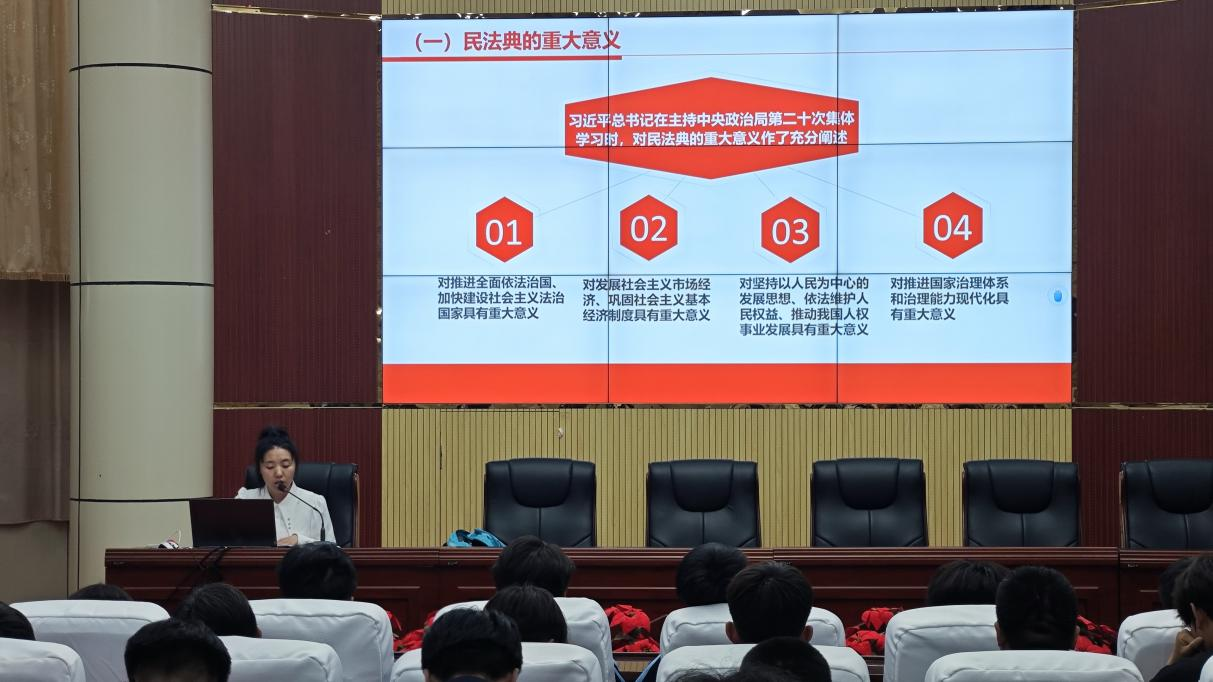 讲座邀请了马克思主义学院张琦老师,张老师从民法典的编纂历程入手,深入浅出地介绍了民法典在我国法治建设中的重要地位和深远意义。她强调,民法典作为我国第一部以法典命名的法律,是新时代我国社会主义法治建设的重大成果,它系统整合了我国多年来长期实践形成的民事法律规范,汲取了中华民族5000多年优秀法律文化,借鉴了人类法治文明建设有益成果,是一部体现我国社会主义性质、符合人民利益和愿望、顺应时代发展要求的法典。