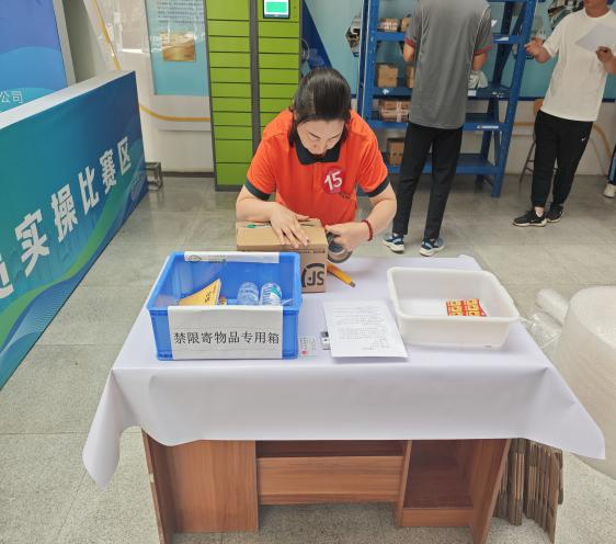 大赛紧密围绕快递员、快件处理员两大核心岗位,设置"理论知识+实操技能"重考核体系,涵盖多物品收寄、智能快递柜操作、总包拆封、异常快件处理四个竞赛项目。在多物品收寄环节,选手需精准识别违禁品,同步运用环保材料完成绿色包装设计,既考验安全底线意识,又融入低碳发展理念;智能快递柜操作中,选手凭借扎实的行业前沿知识和敏捷的操作手法,高效完成快件入柜全流程,充分展现数字化时代的职业技能水平。