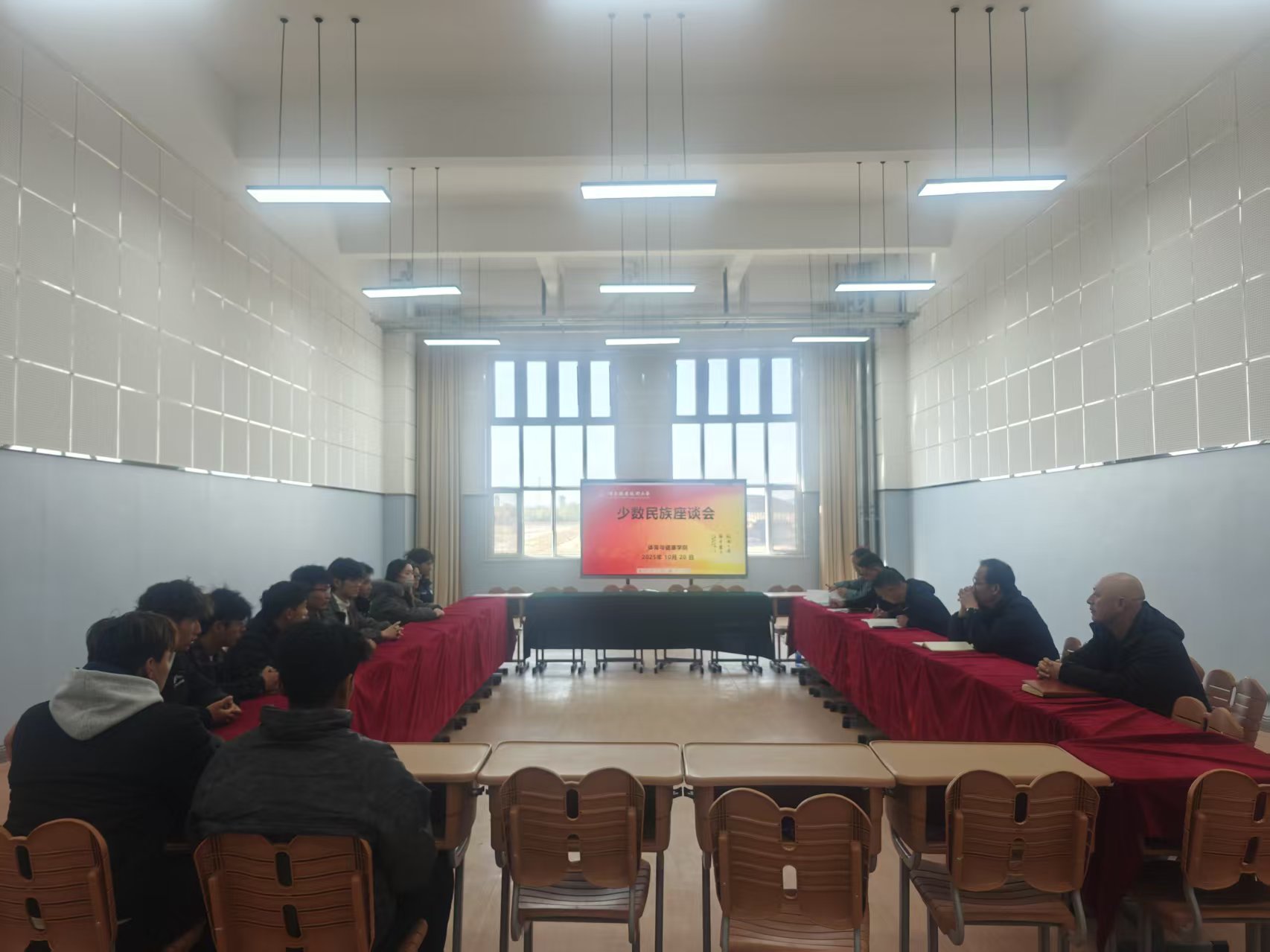 为深入了解少数民族学生的学习生活状况,进一步加强沟通与关怀,2025年10月20日,体育与健康学院组织召开了少数民族学生座谈会。学院相关领导、辅导员以及不同年级的12名少数民族学生代表共同参加了此次交流。