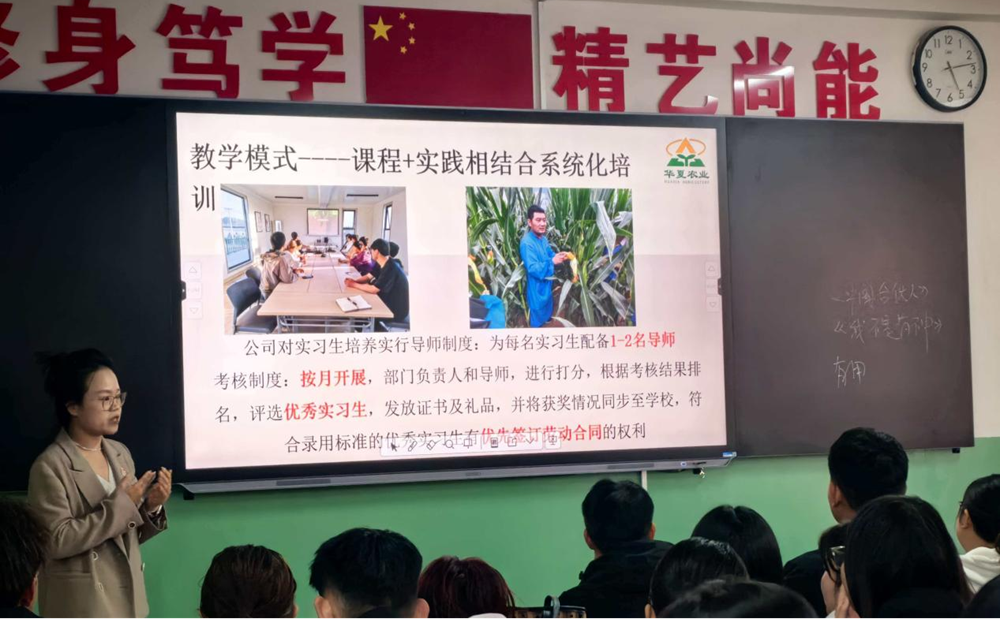 宣讲会上,企业代表从公司概况入手,详细介绍了新疆华夏农业有限公司的发展历程、产业布局以及在现代农业领域的技术优势与市场地位。随后,宣讲人围绕企业文化、员工关怀、衣食住行保障、岗位设置及薪酬福利体系等方面展开全面讲解,帮助同学们对企业形成系统而深入的认识。