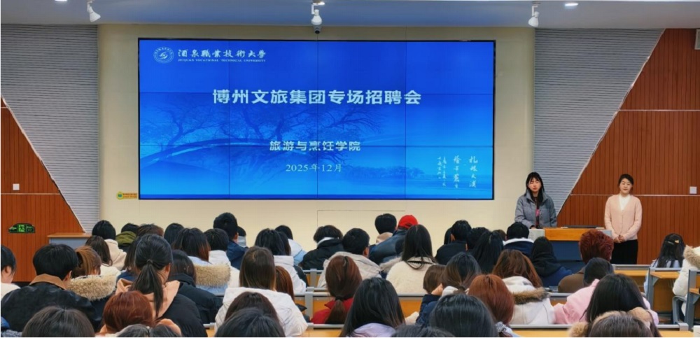 2025 年 12 月 8 日,新疆博州赛里木湖文化旅游投资集 团有限公司(以下简称“赛里木湖文旅集团”)一行莅临旅 游与烹饪学院,举行校企合作洽谈会,学院副院长杨蕊肇、 副院长董轩与企业代表深入交流。随后为 2023、2024 级旅 游管理、研学旅行管理与服务专业 200 余名学生举办专场招 聘会。