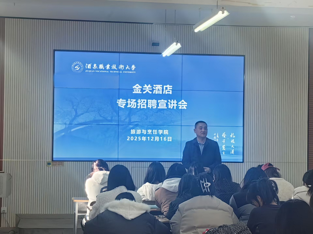 招聘现场,航天镇金川酒店总经理李总一行通过企业宣讲、岗位答疑、实景展示、互动交流等多形式,向在场学生全面介绍了酒店的发展历程、核心业务优势、特色企业文化及完善的人才培养体系。针对毕业生高度关注的职业发展路径,招聘负责人重点解读了酒店“阶梯式培养+个性化成长”的专属人才计划——从系统性岗前培训、阶段性技能提升,到管理岗位阶梯式晋升,为青年员工量身打造全周期职业发展支持体系。同时,通过实地环境视频、员工生活场景分享等方式,让学生直观感受酒店的工作氛围与生活保障,进一步增强求职意愿。