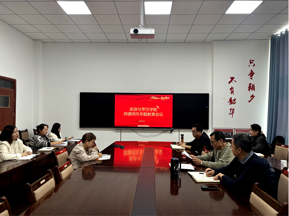 为深入贯彻新时代教师职业行为十项准则,切实加强学院教师队伍建设,2025年12月16日,旅游与烹饪学院组织召开师德师风专题教育会议。学院全体教师共同参与本次主题学习。会议由学院党支部书记张来顺主持。