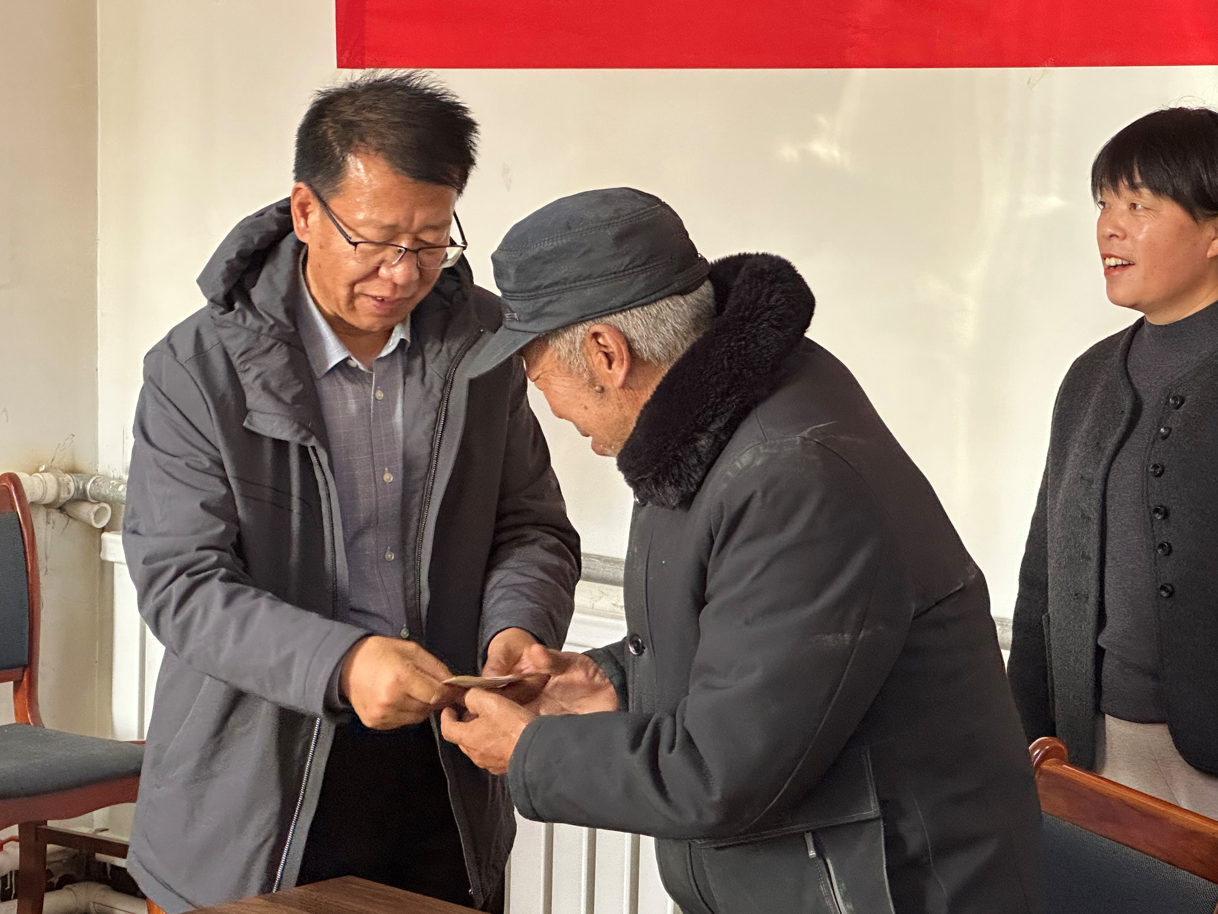 王金明分别与果园镇小坝沟村、丁家闸村过冬困难的20户脱贫户、边缘户、孤寡老人进行了亲切座谈交流,深入了解了他们生产、生活情况,嘘寒问暖,贴心关怀。随后又向他们发放了户均500元的买煤慰问金。