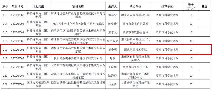 近日,甘肃省科技厅下发2025 年度省级科技计划项目通知,我校共有5项科技计划项目获批立项,立项总金额达34万元,立项数量、项目类别、立项金额均取得新突破。其中,酒泉肉用绵羊高效繁育关键技术研究与集成示范获批科技特派员(团)专项;丘陵山地履带牵引平台伺服控制策略研究和太阳能光伏组件智能清洗装备的研发与应用2个项目获批科技专员专项;基于典型焊接位置电弧增材制造铝合金悬垂结构工艺和性能研究获批高技能人才专项;RUNX1调控牦牛脂肪细胞分化的作用机制研究获批青年科技基金项目。