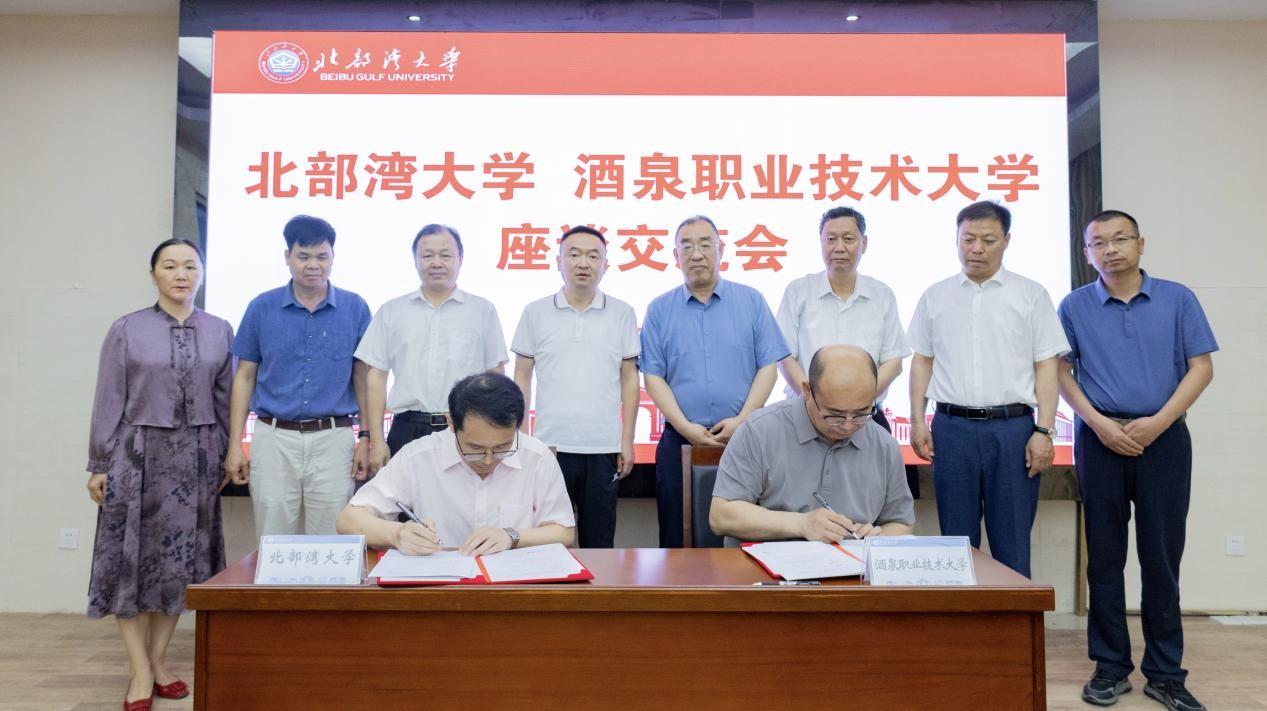座谈会结束,两校代表签署了校校合作协议。北部湾大学党委副书记、校长苗剑和学校党委副书记、校长许军出席并见证签约。