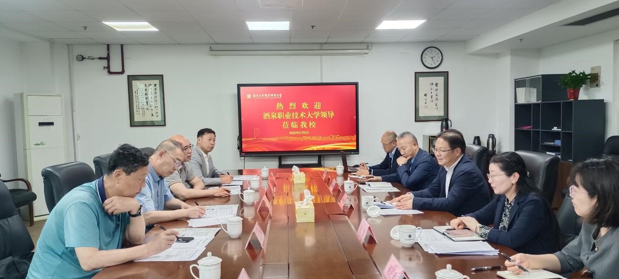 在南京工业职业技术大学,党委副书记、校长何学军对我校的来访表示热烈欢迎,介绍了南京工业职业技术大学基本情况以及职业本科办学试点情况。许军代表酒泉职业技术大学师生,向南京工业职业技术大学长期以来的关心支持表示最衷心的感谢,并介绍了我校基本情况以及职业本科院校升格情况。他表示,南京工业职业技术大学作为职业本科教育的“探路者”,在内部管理机制、校院两级治理、质量保障体系等方面积累了丰富经验。一是把协议落得更实,与贵校做个对部门对接。二是把支持落得更细。真诚希望能在开展本科层次办学评价、师资队伍建设、学科专业建设三个方面给予具体指导。三是把合作走得更深,开展协同攻关,共同服务国家战略和地方产业需求。何学军校长分享了学校在在人才队伍建设、持续推进教育教学改革、产教融合、国际化办学等方面取得的成果与探索经验。他表示,作为全国首家公办本科层次职业教育试点学校,在职业教育改革发展中始终走在前列,有切实扛起试点示范的使命,将尽最大努力给予我校职业本科建设指导和帮助。座谈会上,双方还围绕绩效考核与分配、干部队伍建设、高层次人才队伍建设等内容进行了深入交流和探讨。