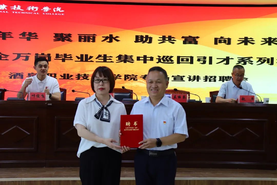 校园宣讲会现场座无虚席,莲都区人社局副局长兰丽琴与企业代表依次就莲都区城市发展、人才政策、企业背景、岗位需求等方面展开分享,在场的学生对莲都这座城市与莲都区企业表现出浓厚的兴趣。在宣讲会上,莲都为酒泉职业技术学院副校长王立智颁发“引才大使”聘书。