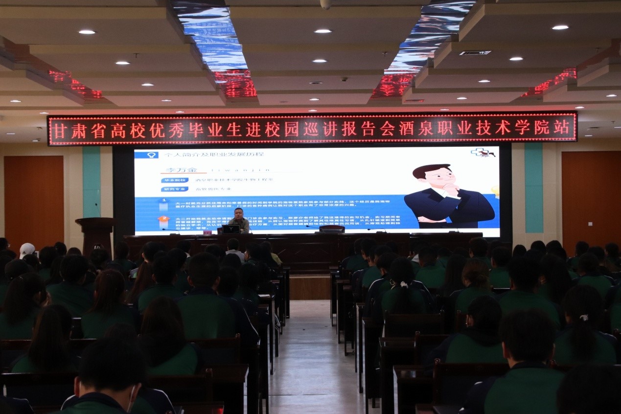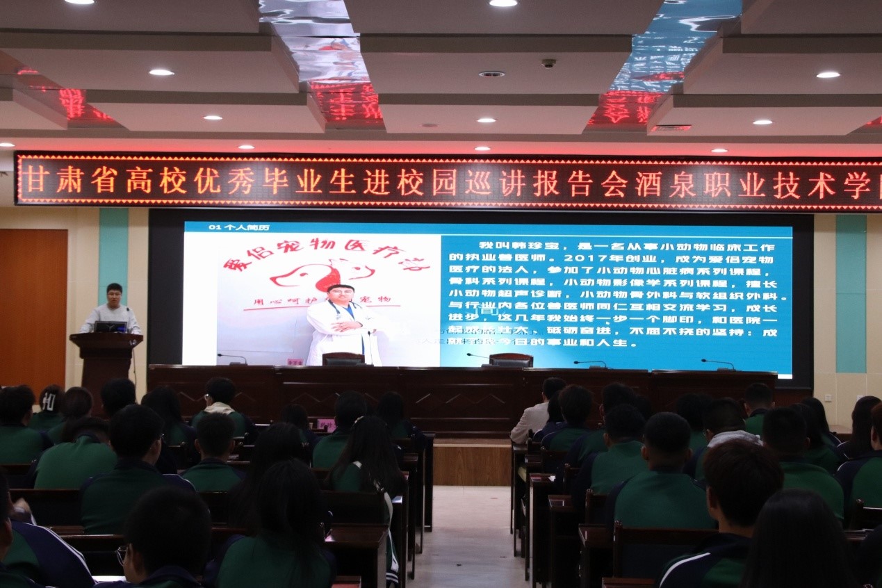 5月4日,由省教育厅主办、甘肃政法大学承办、酒泉职业技术学院协办的“闪亮青春 同辈领航”甘肃省高校优秀毕业生进校园巡回演讲报告会在图书馆四楼会议室举行,学校邀请牧兽医专业2011届秀毕业生李万金和2015届毕业生韩珍宝为学生作报告,350多名学生代表聆听报告。