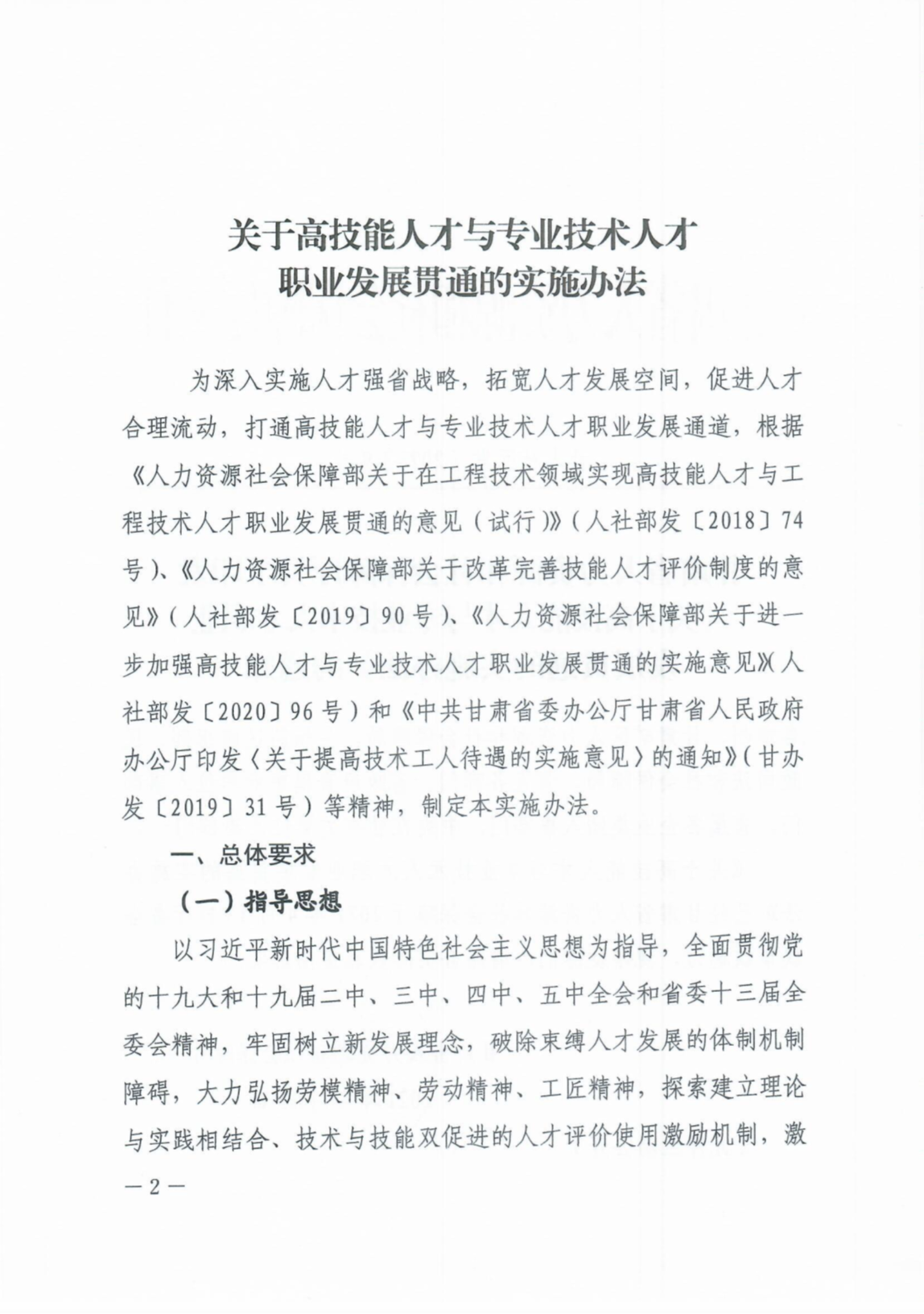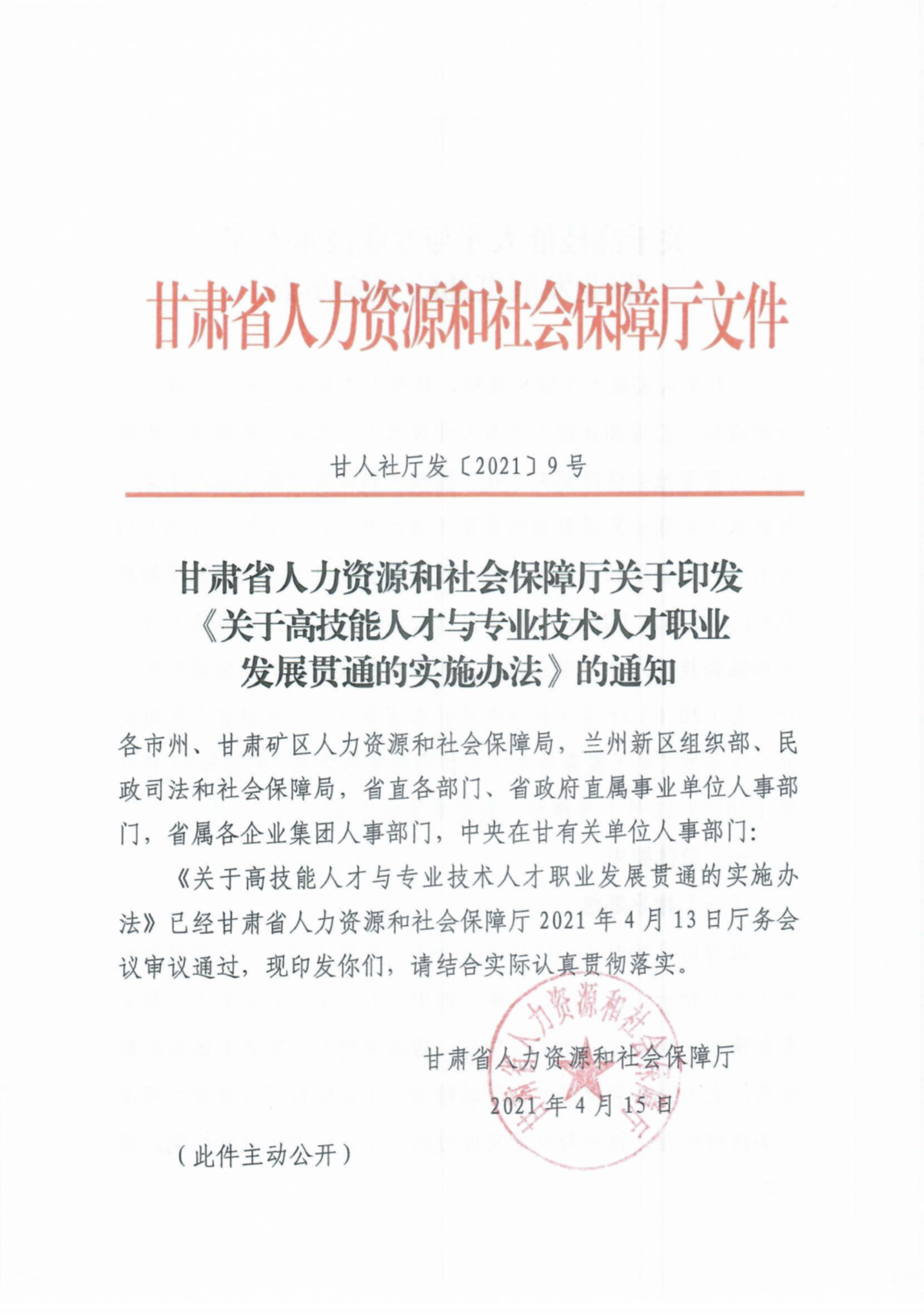 附件:甘肃省人力资源和社会保障厅关于印发《关于高技能人才与专业技术人才职业发展贯通的实施办法》的通知