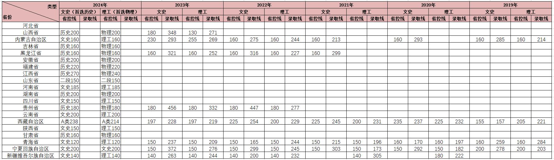 酒泉职业技术学院近六年普通高考最低控制线与录取线