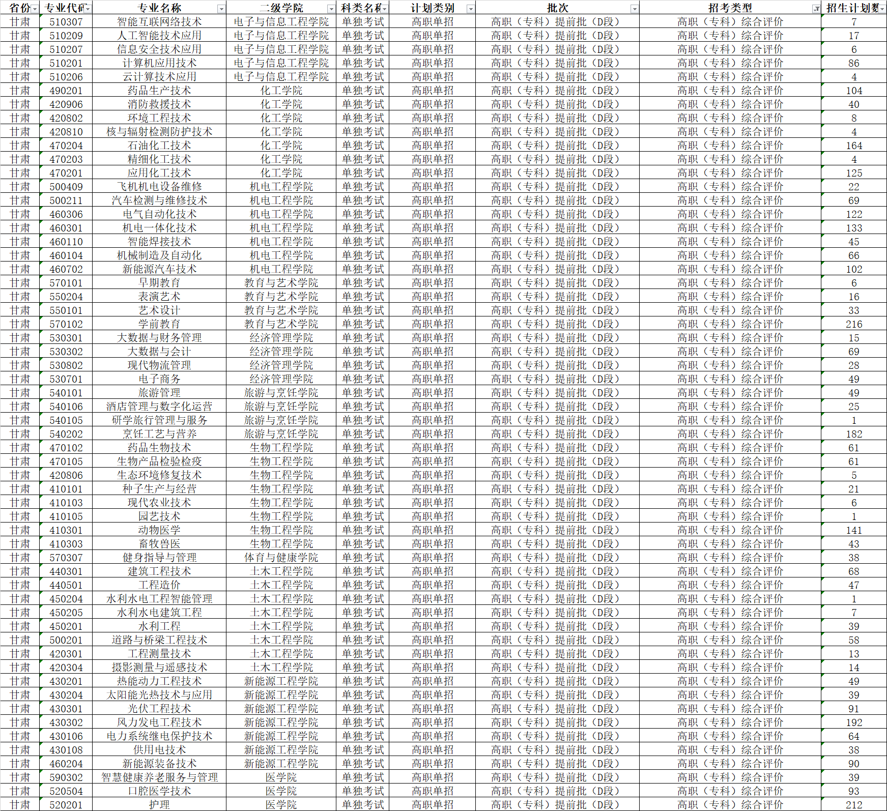 酒泉职业技术学院2024年综合评价招生专业及计划
