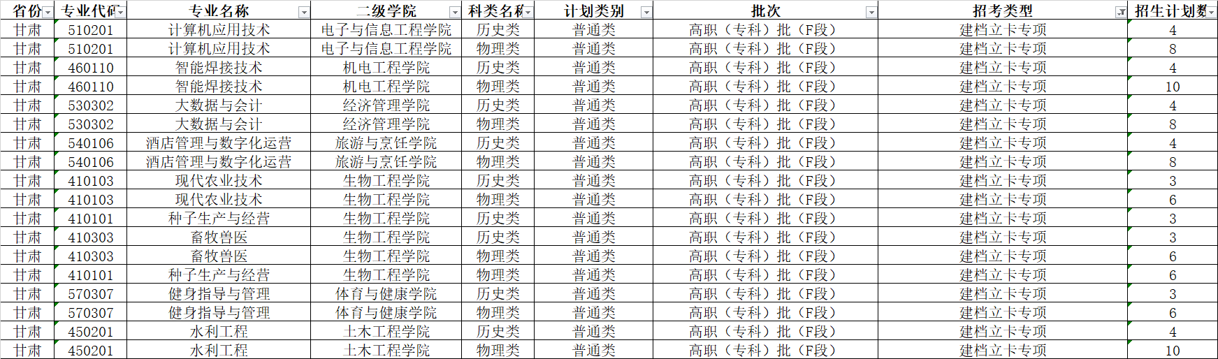 酒泉职业技术学院2024年建档立卡专项招生专业及计划