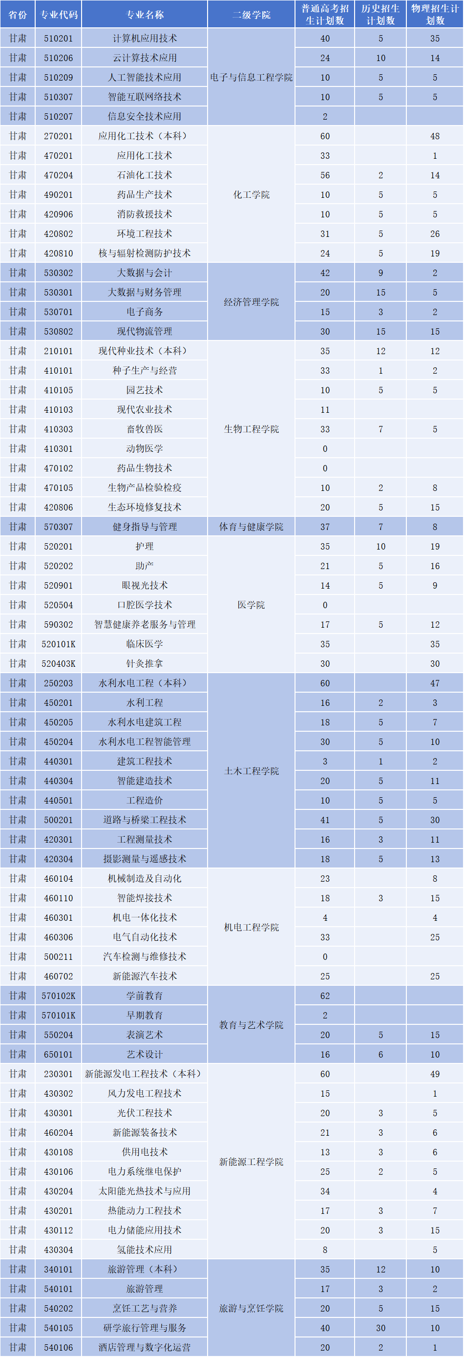 酒泉职业技术大学2025年甘肃省普通高考招生专业及计划